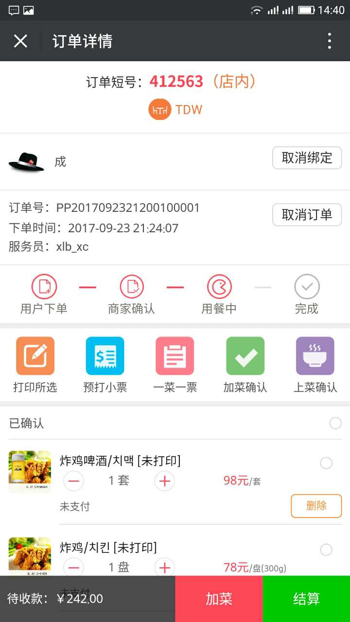 客人如不用线上支付时,订单可采用线下收款的方式进行结算,这时服务员进入订单详情页面,点击结算按纽,如图所示: