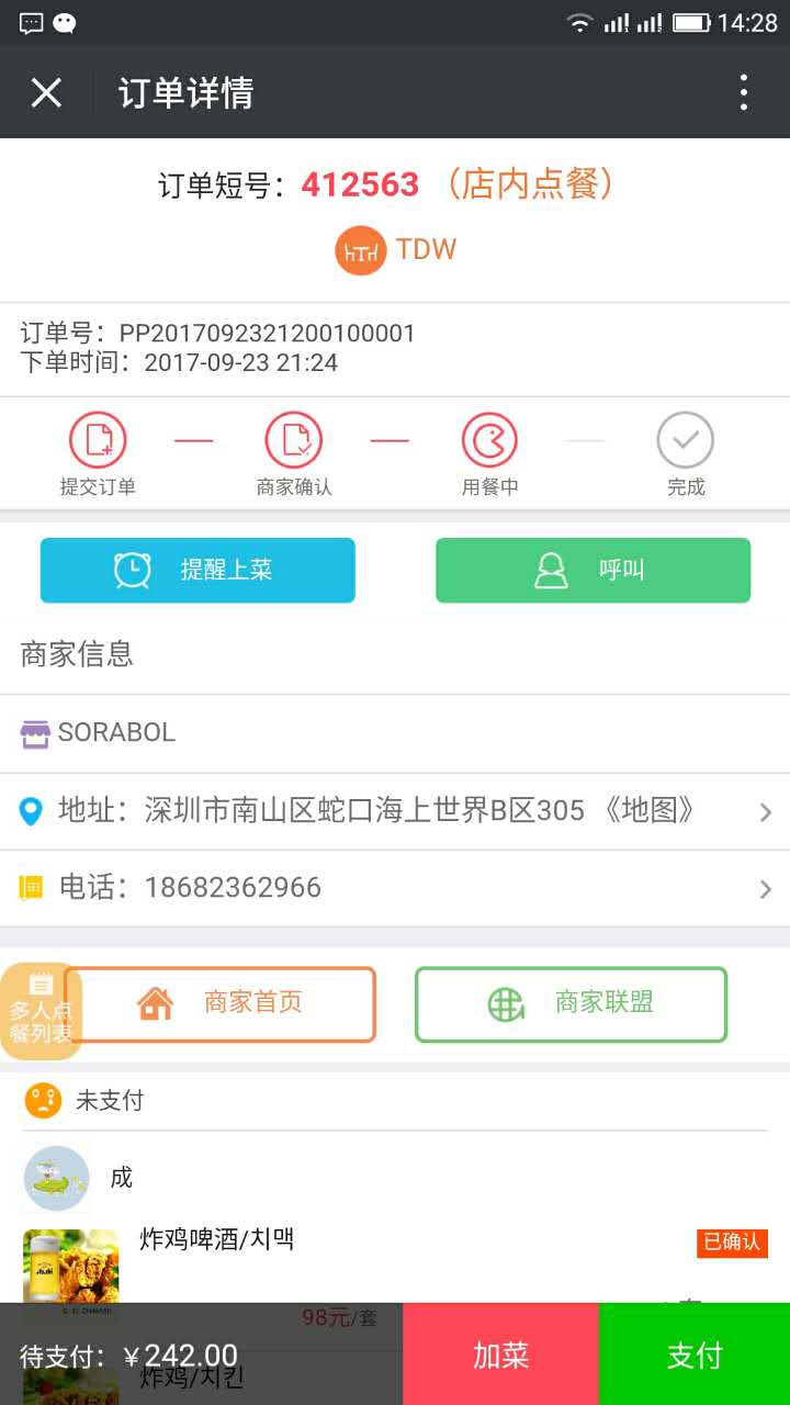 客人自助点菜后,结账时只须扫描桌子上的二维码,即可进入订单详情,通过点击支付按纽,进行支付操作。如图所示: